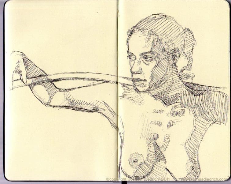 Moleskine 2010a Moleskine sketchbook Studio drawings, drawings in bars, drawings from circus practice, all in Parker ballpoint pen. Pocket contains a postcard for Paw Paw Elvis. 2010